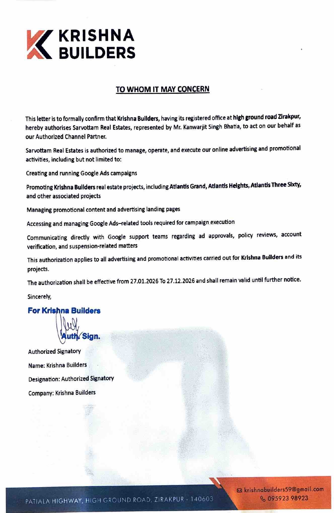 Krishna Builders & Promoters have over 10 years of experience in real estate and construction, successfully delivering quality residential projects across Punjab and Haryana with a strong focus on modern design, comfort, and long-lasting value. Krishna Buildtech Zirakpur presents premium developments including Atlantis Grand Zirakpur, Atlantis Heights, and Atlantis Three Sixty, offering a perfect blend of luxury and convenience. These thoughtfully planned projects feature spacious 3+1 BHK apartments built with advanced Mivan construction technology, ensuring superior strength, durability, and elegant finishing for a truly premium lifestyle.